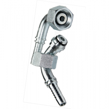 Terminal hembra giratória, curva 90º, rosca milimétrica, paso de rosca 1,5 y 2,0, vedación Boleada - DKO, hecho en acero carbono para prensado de mangueras hidráulicas.