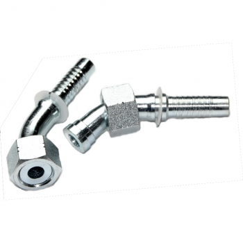 Terminal hembra giratória, curva 45º, rosca en pulgada UNF, vedación sede plana O´Ring, hecho en acero carbono, para prensado de mangueras hidráulica.