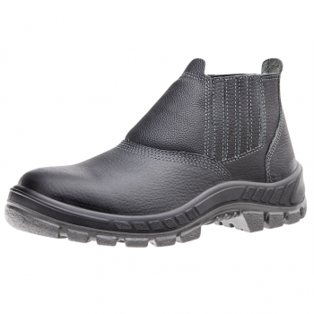 Botín de seguridad con elástico, capellada de cuero flor, forro sintético, plantilla sintética fijada por el proceso strobel, suela PU bidensidad inyectada directamente a la capellada.