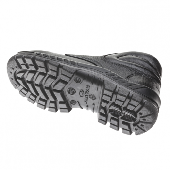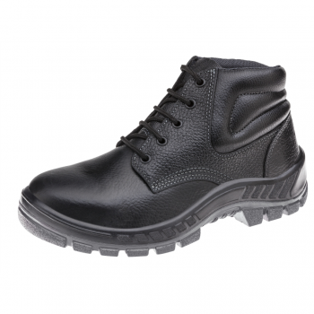 Botín de seguridad con cordón, capellada de cuero flor, forro sintético, plantilla sintética fijada por el proceso strobel, suela PU bidensidad inyectada directamente a la capellada.