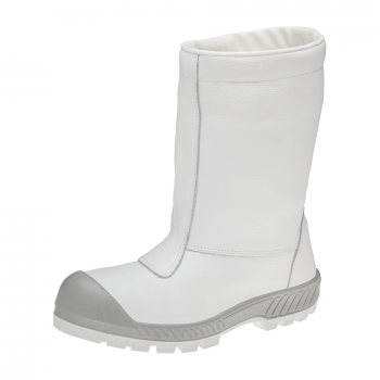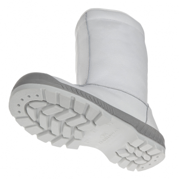 Calzado de seguridad blanco tipo coturno, piel fabricada en M Micro, forro de tejido térmico resistente a -30ºC, plantilla de montaje térmica resistente a -30 º C fijada mediante proceso Strobel, suela PU Bidensidad inyectada directamente a la piel.