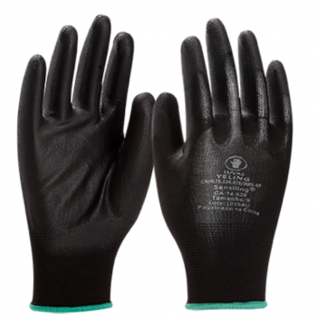Guante tricotado sin costura, confeccionado en fibra sintetica, revestido en la palma y punta de los dedos en Poliuretano.