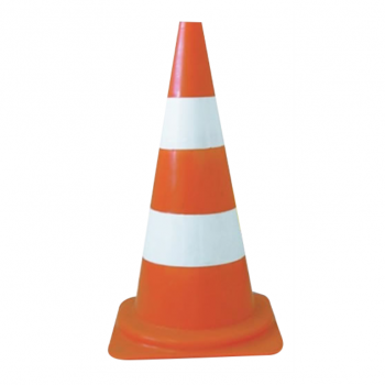 Cono para señalización y seguridad inyectado en PP (polipropileno) en una pieza única en dos colores: negro y amarillo o naranja y blanco.