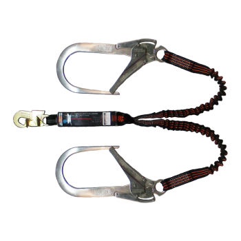 Cabo de vida anticaídas doble de 1,5 metros. Cinto de poliester de alta tenacidad de 35 mm elastizado. Tres mosquetones (uno de 18mm y dos de 110mm de apertura). Amortiguador anticaida. Norma utilizada: Iram 3622-1